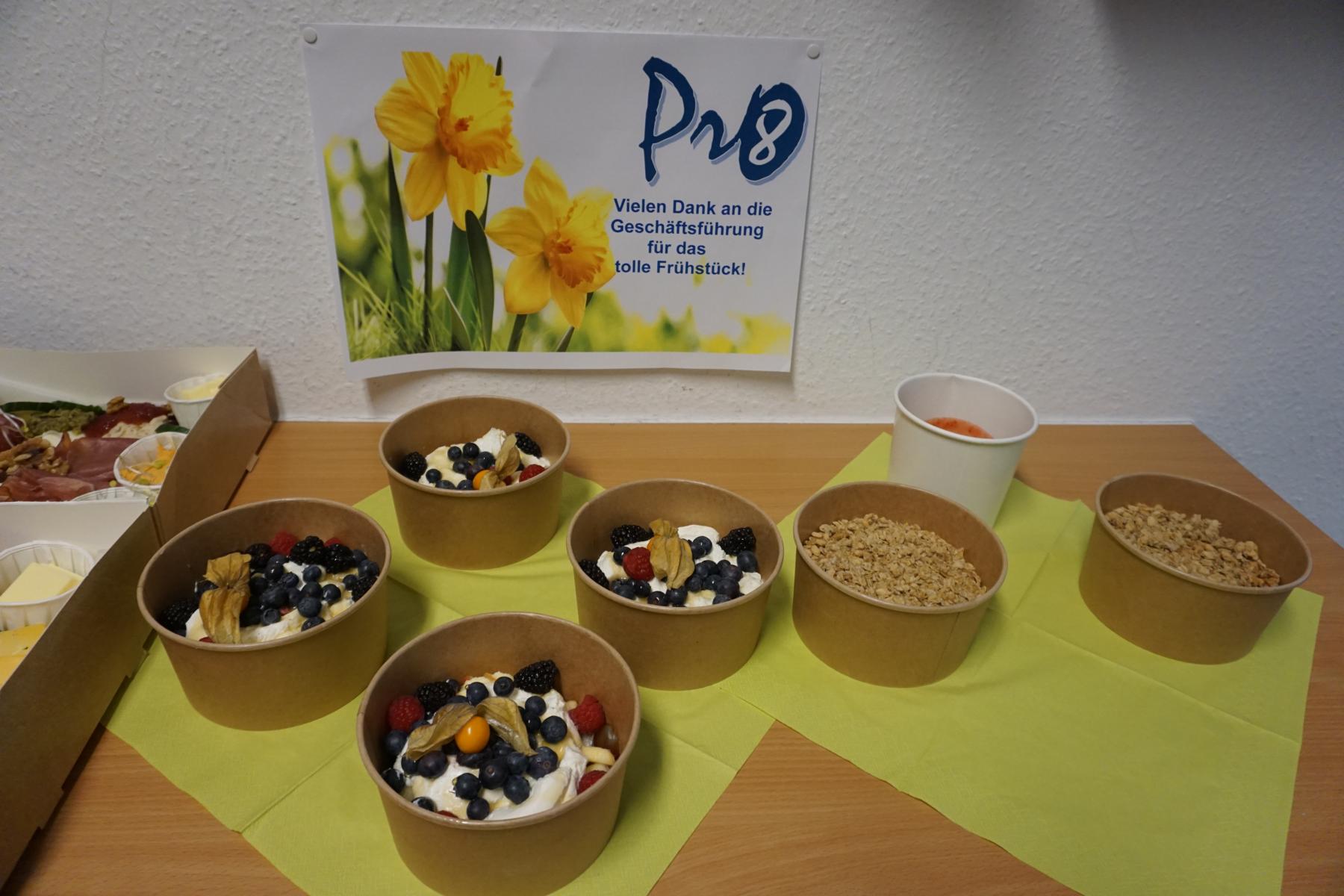 Erkelenz/Bedburg. Ein tolles Frühstück von Leni liebt Kaffee wartete jetzt auch auf unsere Kollegen in der Pro8 Erkelenz und in der Pro8 Bedburg. Die Geschäftsführung hat sich für unsere Mitarbeiter und ihre wichtigste Mahlzeit des Tages etwas besonderes einfallen lassen. Mit einer Frühstücksidee für echte Genießer, die Energie für den ganzen Tag spendet, überraschten sie die Mitarbeiter unserer Einrichtungen. Ob herzhaft oder süß, diesem Frühstück fehlt es an nichts: verschiedene Sorten Aufschnitt, hausgemachter Brotaufstrich, frisches Gemüse, Beeren, Nüsse, Joghurt, Pesto und allerlei Dipps – so kann der Start in den Tag beginnen!